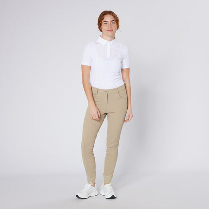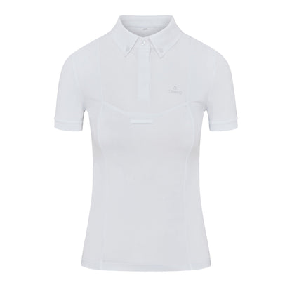 Classic show shirt is lightweight and breathable, with short sleeves for a more comfortable fit under your show jacket than your more traditional show shirts. Button up and loop hole to secure tie in place.