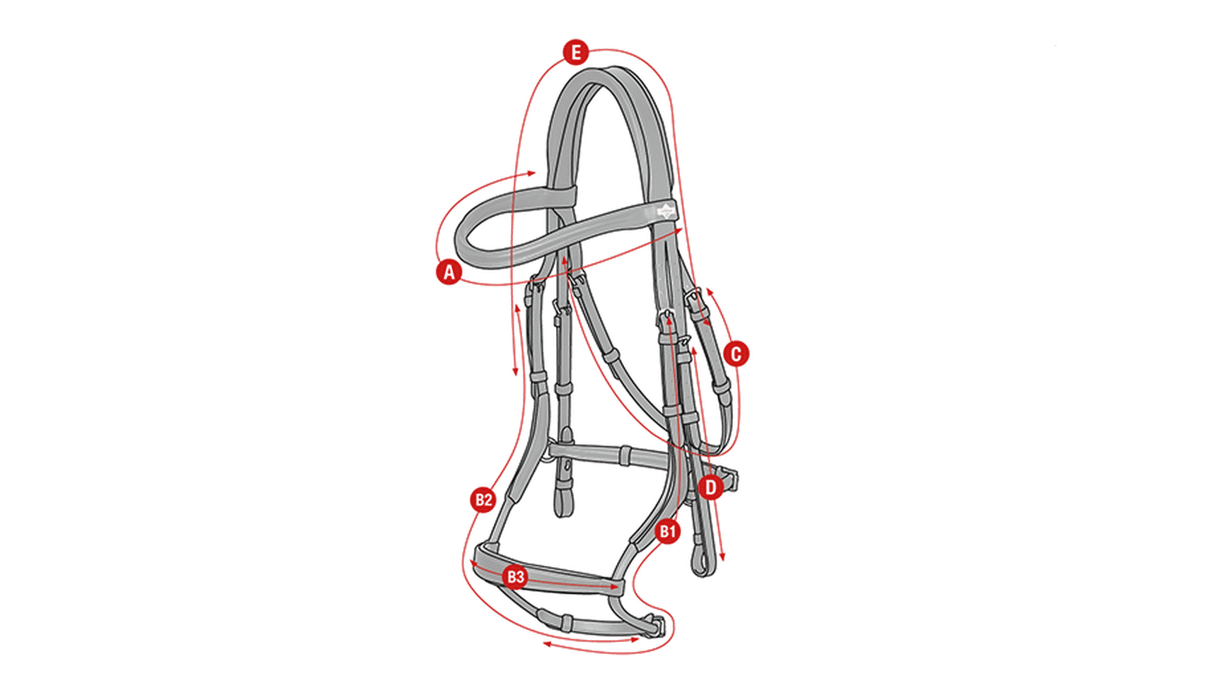The soft padded headpiece is anatomically shaped for clearance behind the ears. The distinctive arc noseband sits clear of the horse's cheeks and teeth to avoid pressure on these sensitive areas, with padding over the bridge of the nose for comfort. Double buckles on the noseband and throat lash allow precise and even adjustment.